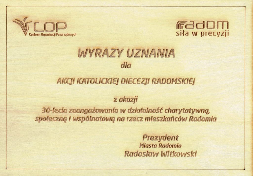 Akcja Katolicka Diecezji Radomskiej otrzymała od Prezydenta Miasta Radomia, Dyplom Uznania z okazji 30-lecia zaangażowania w działalność charytatywną, społeczną i wspólnotową na rzecz mieszkańców Radomia.