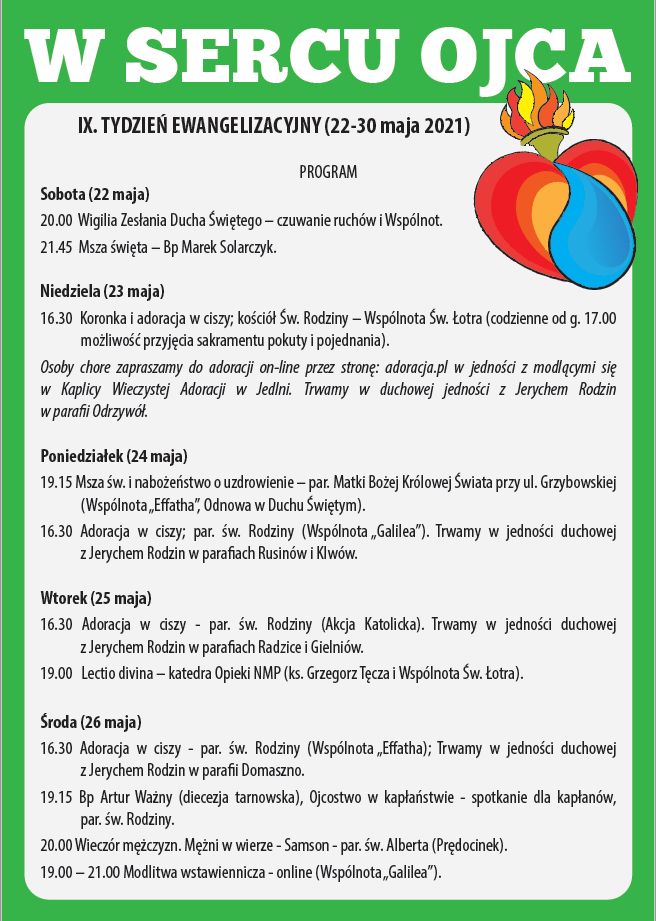 Przed nami Wigilia Zesłania Ducha Świętego oraz IX Tydzień Ewangelizacyjny, na który w imieniu organizatorów serdecznie zapraszamy.