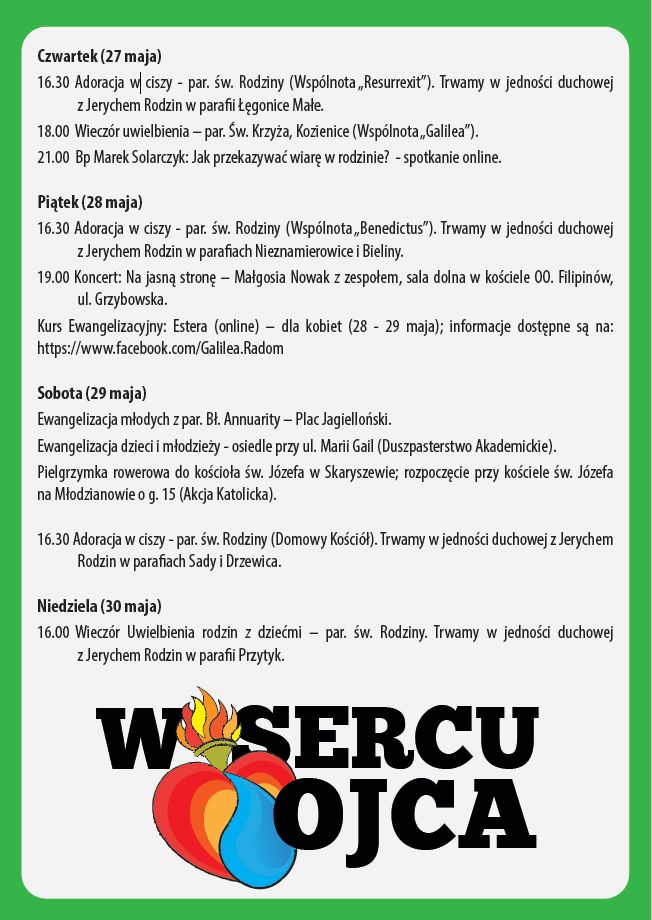 – Wtorek (25 maja) 16.30 Adoracja w ciszy – par. św. Rodziny (Akcja Katolicka). Trwamy w jedności duchowej z Jerychem Rodzin w para ach Radzice i Gielniów