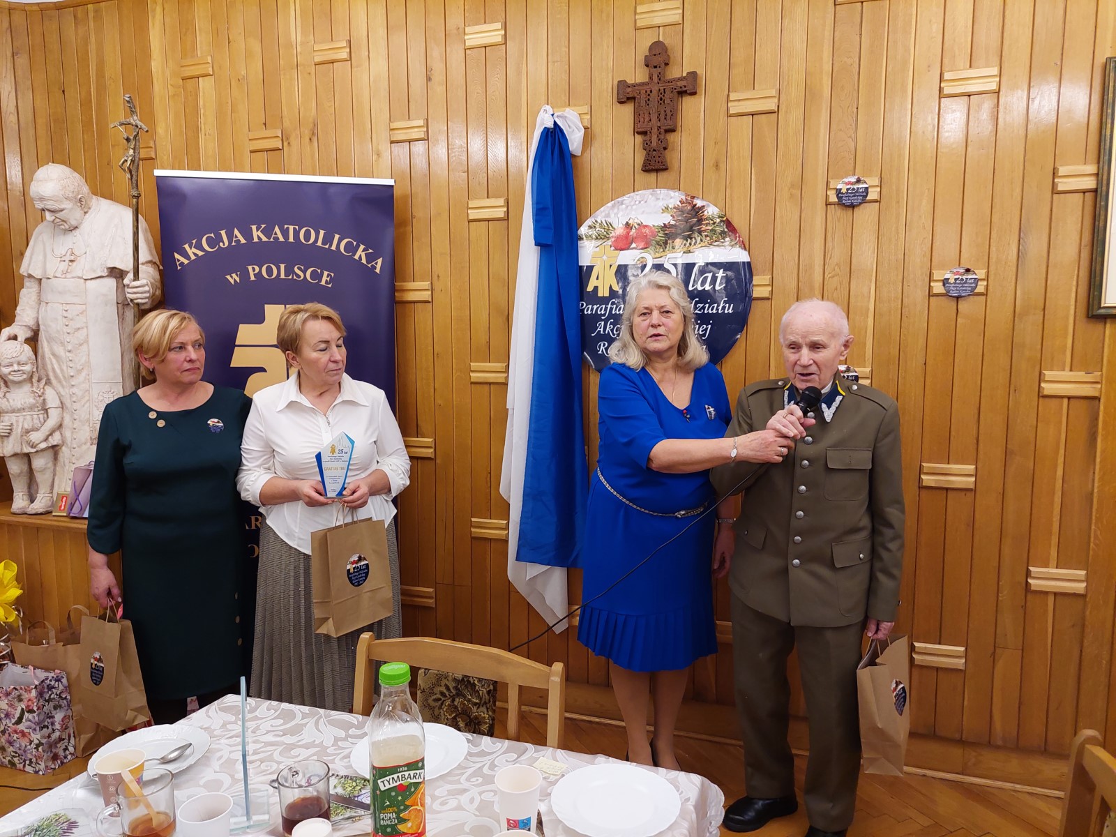 Przed błogosławieństwem ks. celebrans Krzysztof Ćwiek podziękował za przybycie i uczestnictwo w Eucharystii wszystkim zaproszonym gościom oraz przekazał naszemu Oddziałowi serdeczne gratulacje, podziękował za dotychczasową działalność w służbie dla Kościoła i życzył nam owocnej działalności w wypełnianiu swojej misji w Kościele i dla społeczności parafialnej na następne lata. Po uroczystej Mszy Świętej zaproszeni gości udali się do Sali Parafialnej, gdzie wszyscy wspólnie dalej świętowaliśmy nasz srebrny jubileusz. Nie zabrakło na stołach pysznych dań i gorącego dobrego obiadu. Kawa i herbata wraz z różnorodnością wspaniałych wypieków rozpieściły podniebienia gości.