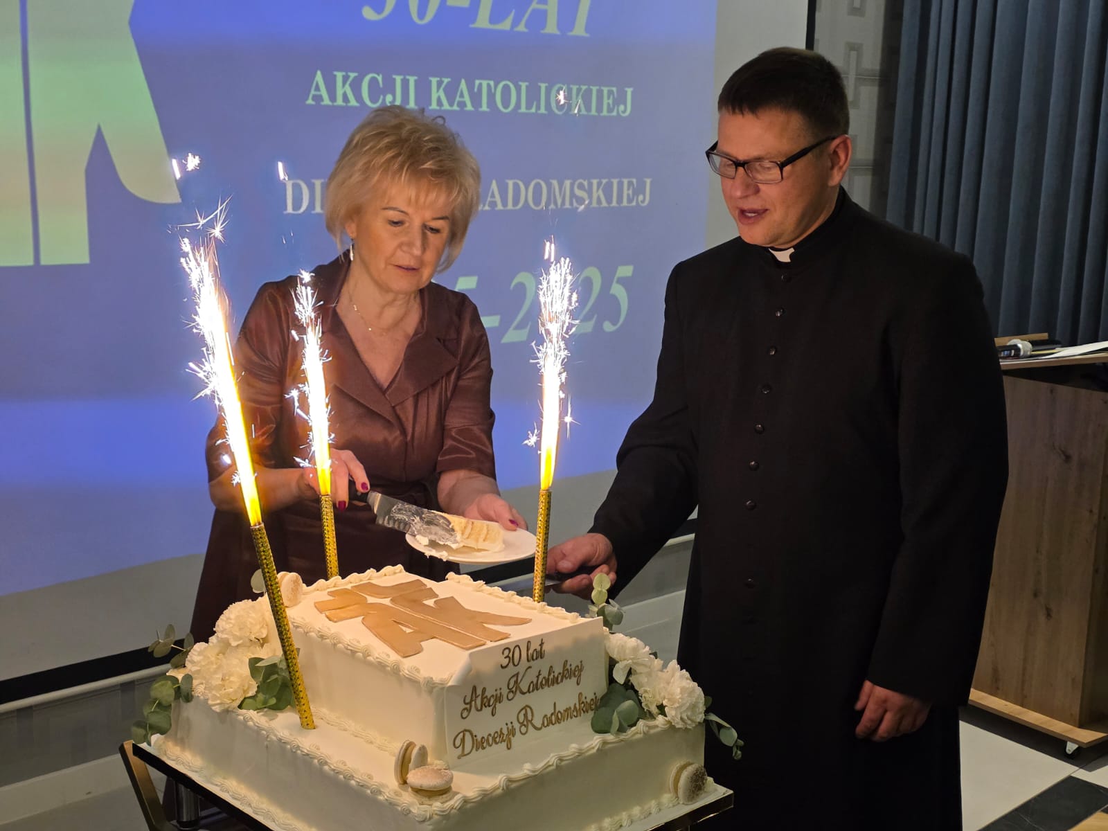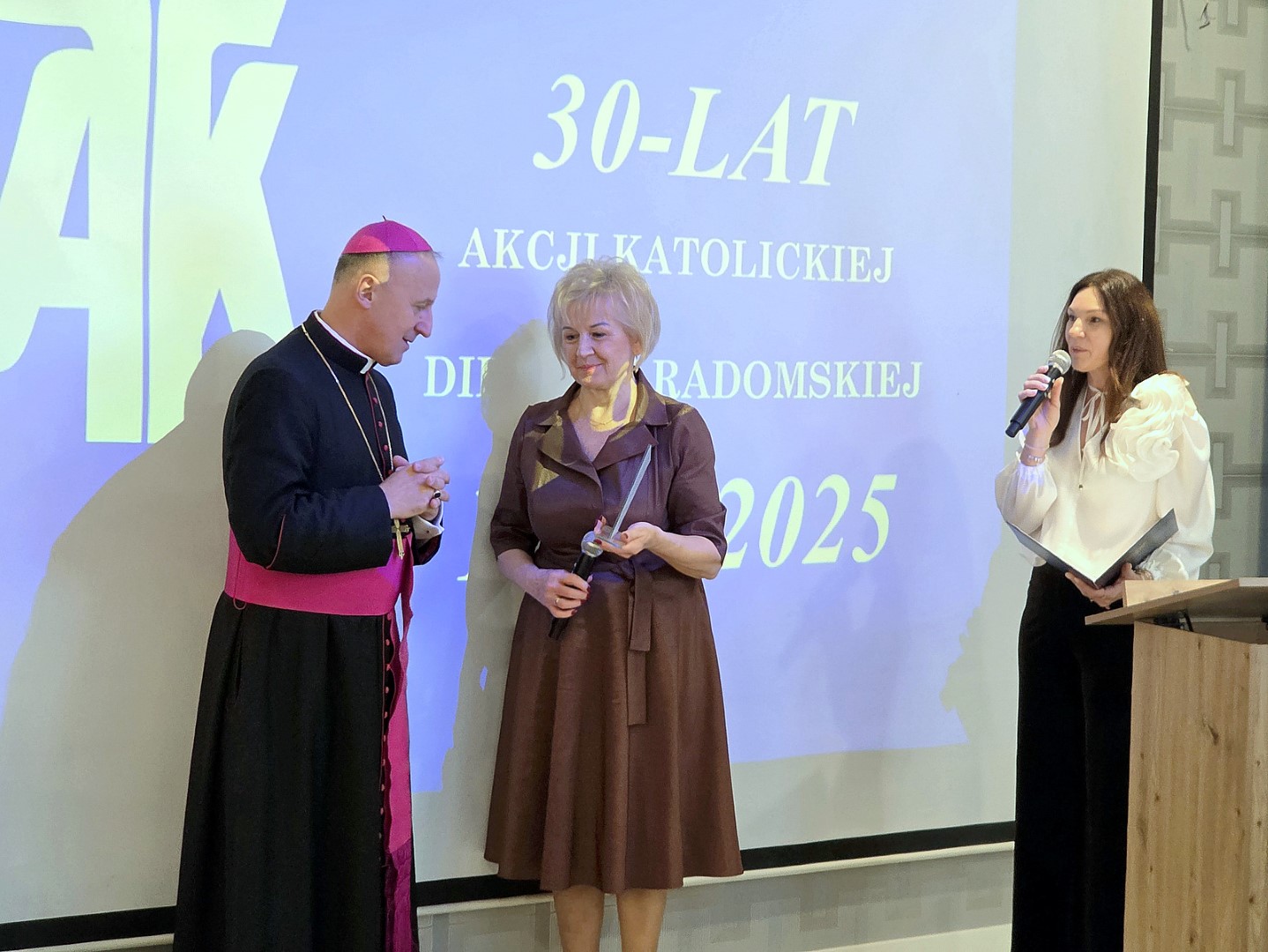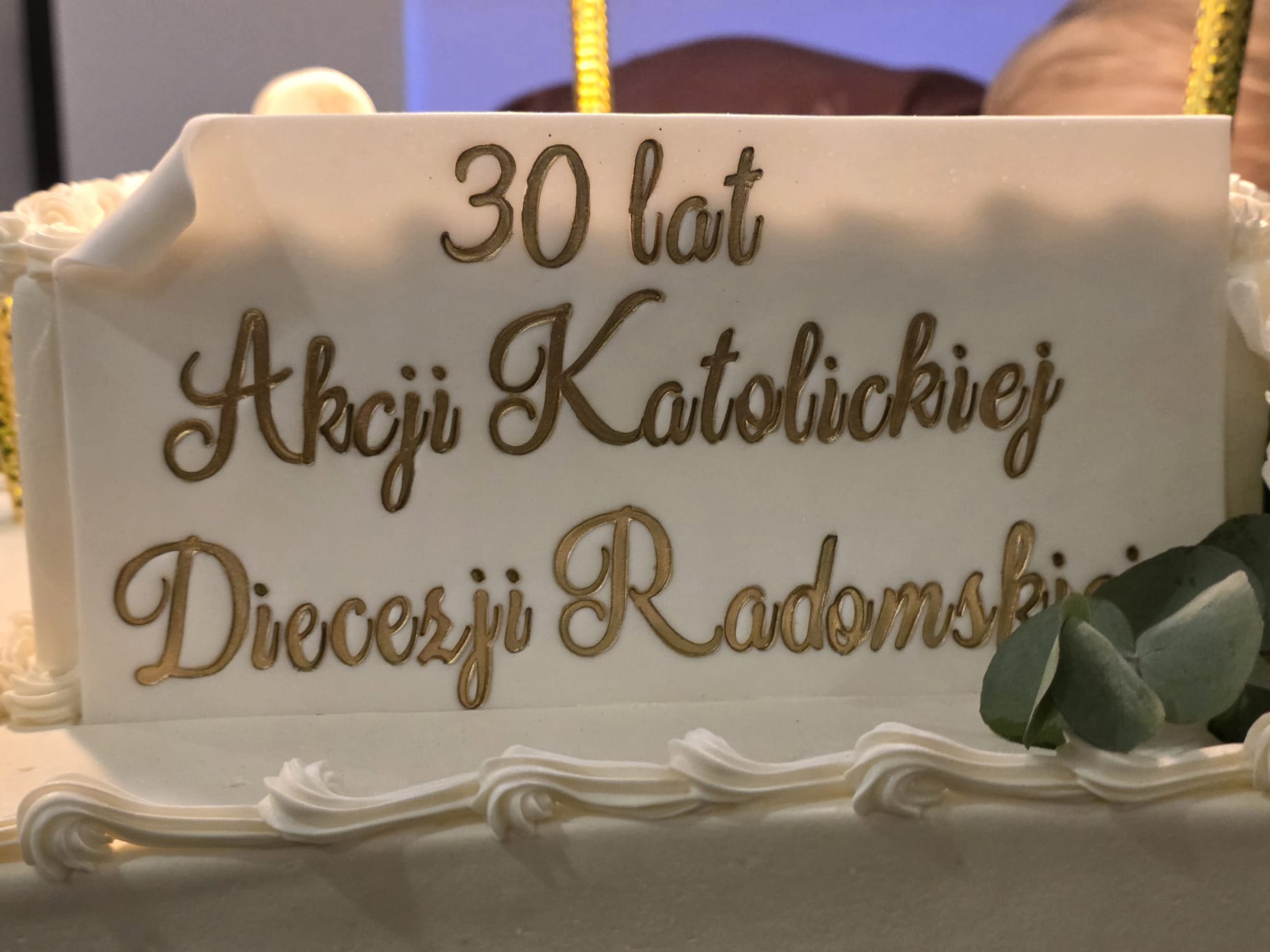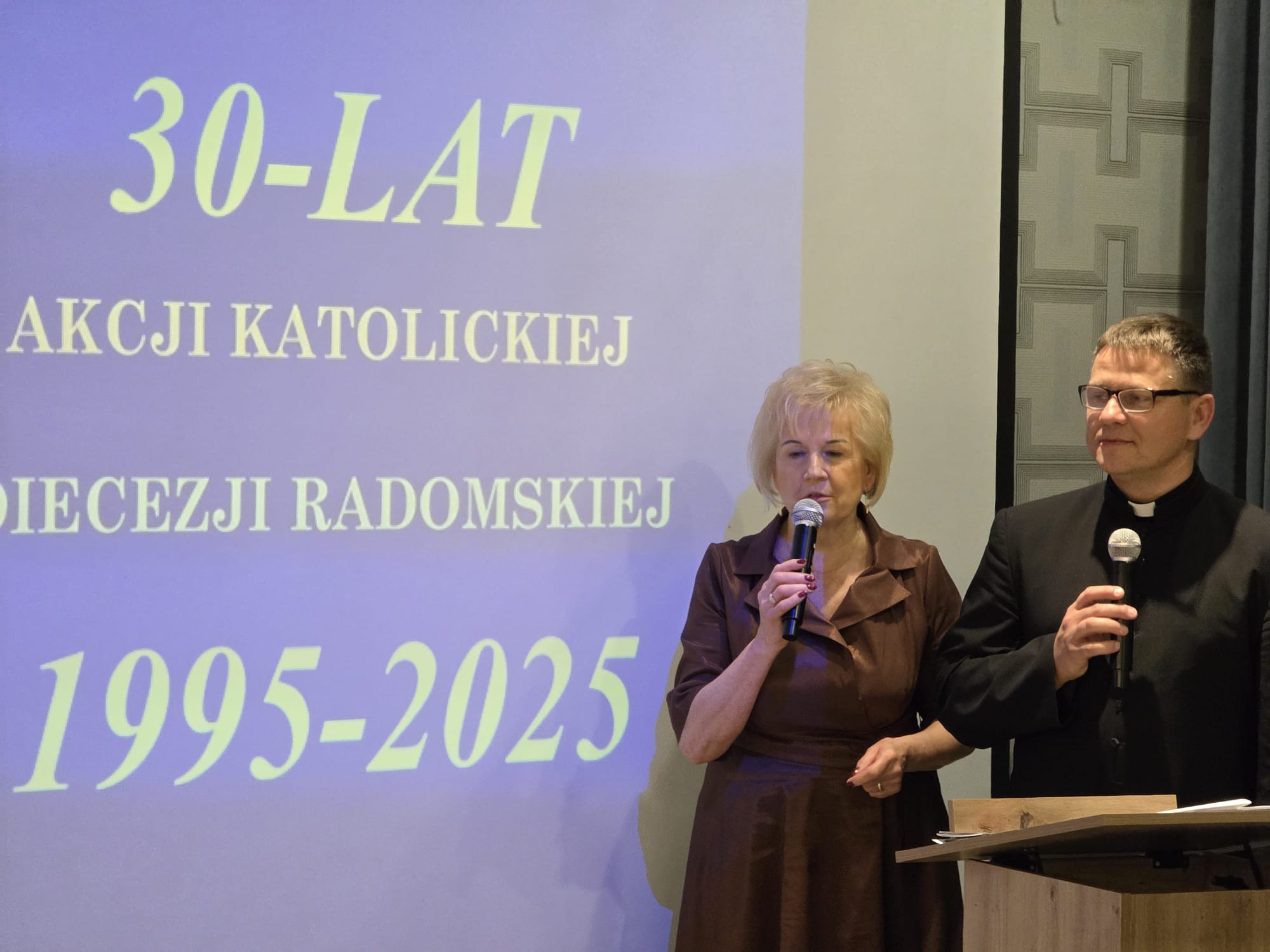 Po Eucharystii kontynuowaliśmy uroczystości w Sali konferencyjno-bankietowej AVIATOR w Radomiu. Na rozpoczęcie gali Teresa Połeć prezes DIAK powitała gości. Następnie Ks. dr Andrzej Jędrzejewski wygłosił konferencję na temat „ Wezwania dla katolików świeckich w świecie współczesnym”. Podsumowanie działalności Akcji Katolickiej Diecezji Radomskiej w minionym 30-leciu ukazaliśmy w filmie „ Akcja Katolicka w obrazie”. Nie zabrakło też podziękowań, gratulacji i życzeń kierowanych do kapłanów, zarządu, członków Akcji Katolickiej. Zasłużonym dla Akcji Katolickiej zostały wręczone statuetki.