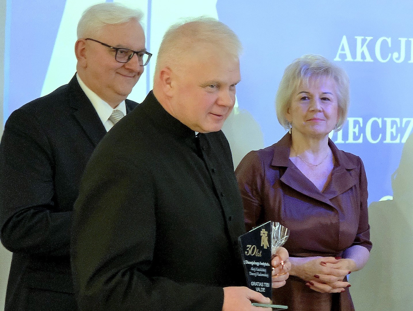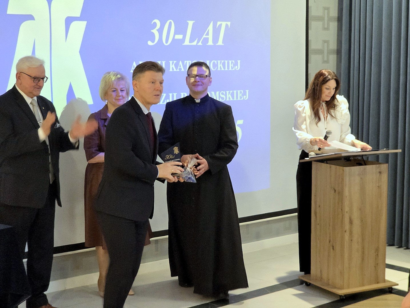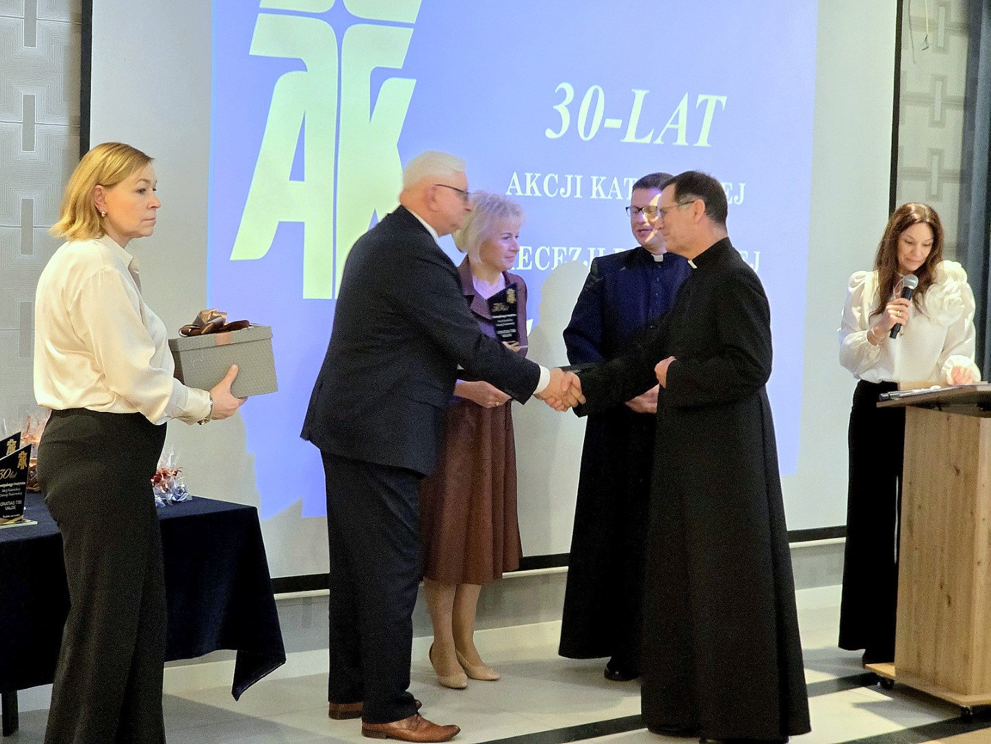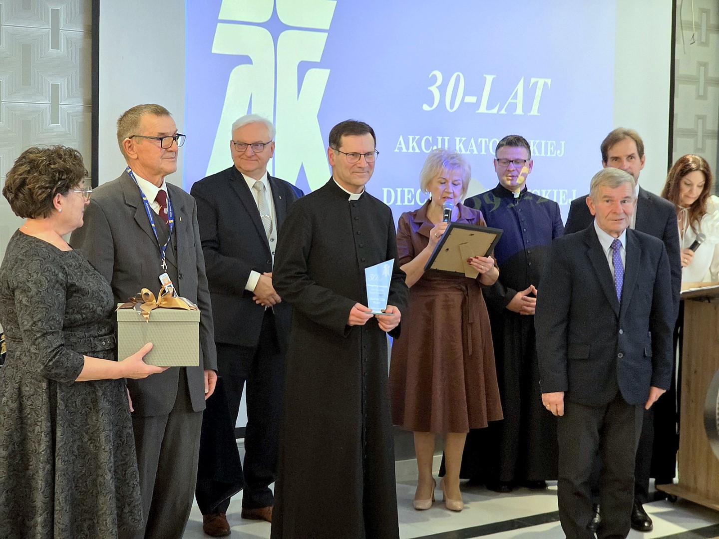 Po Eucharystii kontynuowaliśmy uroczystości w Sali konferencyjno-bankietowej AVIATOR w Radomiu. Na rozpoczęcie gali Teresa Połeć prezes DIAK powitała gości. Następnie Ks. dr Andrzej Jędrzejewski wygłosił konferencję na temat „ Wezwania dla katolików świeckich w świecie współczesnym”. Podsumowanie działalności Akcji Katolickiej Diecezji Radomskiej w minionym 30-leciu ukazaliśmy w filmie „ Akcja Katolicka w obrazie”. Nie zabrakło też podziękowań, gratulacji i życzeń kierowanych do kapłanów, zarządu, członków Akcji Katolickiej. Zasłużonym dla Akcji Katolickiej zostały wręczone statuetki.